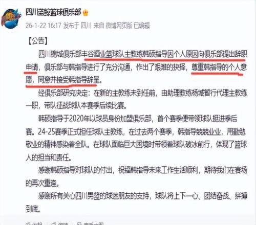 今天下午四点,CBA又一位主教练辞职,得到俱乐部的批准。没错,这就是四川蓝鲸篮球俱乐部主教练韩硕。